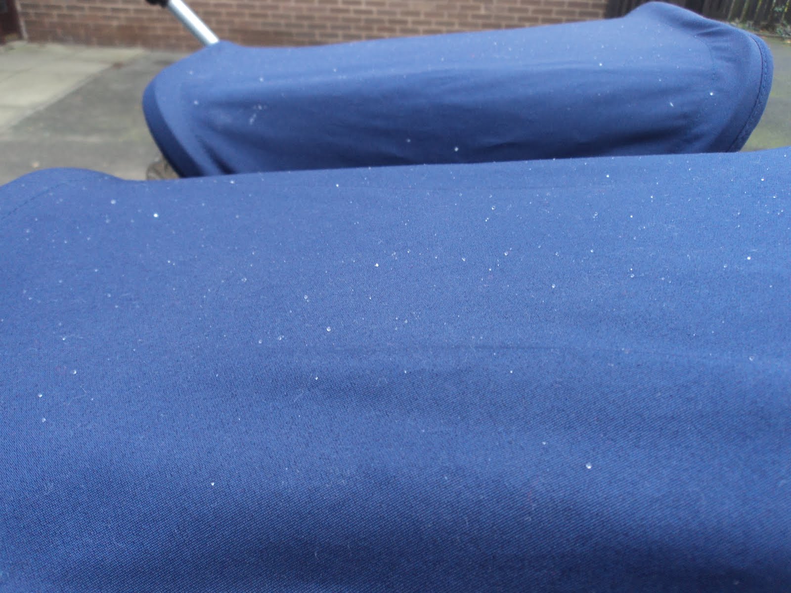 Then, sempat lagi i menyinggah di kedai groceries Pakistan, kebetulan stok buah abis di rumah, nampak plak Pakistan tu dok susun kotak2 buah fresh dr ladang (strawberi, blueberry, pisang, epal, oren, pear dll)..hehe, Hubby i kelam kabut nak balik...uuisshh da alang2 keluar i xsah klu xmenyinggah, lagipun bukan slalu keluar...sejjukkk, nak keluar kna pakai glove, scarf, baju 3/4 lapis + seluar 3 lapis + coat/jumper suit utk bdk2 ni, sock, winter hat, kasut tu tentunya lah..macam2 kna pakai, fuuhh penat! Tgh i dok syok membelek2 buah2 fresh tu, ada something yg menghairankan, i ask my Hubby, dia kata tu 'habuk rokok tu...' hrrmm yeke, tp i perasan semu org dok belek2 langit, apsal la hujan xturun g, lebat ni coz awan tebal.. guess wat ITS SNOWWWWW!!! bukan 'habuk rokok', tp mmg nampak cam debu2 halus dok melayang/terawang2 jatuh dari langit...its really beautiful:) I xble nak capture momment tu coz its very slightly snow & halus cam debu:). Tp i sempat snap masa butiran snow tu still ada atas stroller hood..